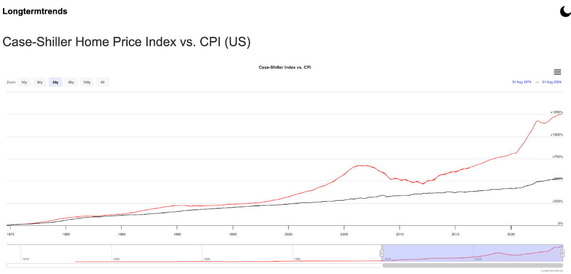 In the chart above from Longtermtrends.net, we can see that the house price is at a 1250% increase compared to the Consumer Price Index (CPI) which is used to measure general inflation. The little bump in the middle is the 2008 housing bubble. We are well past that now.