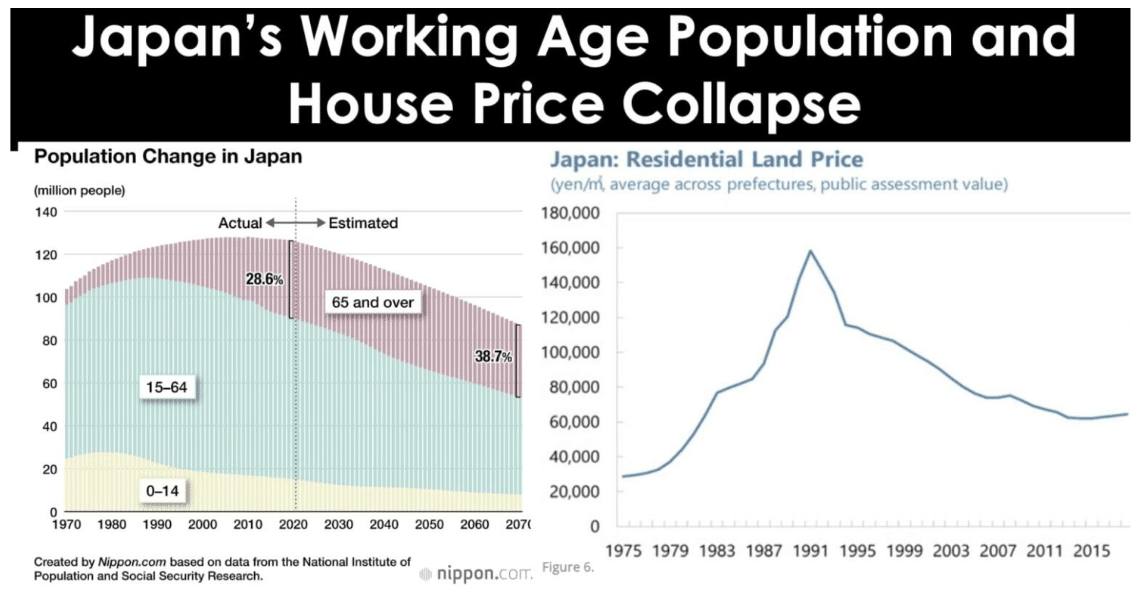 In Japan, the aging population and urbanization have caused the opposite phenomenon. Housing prices peaked in 1991 and have been in decline since then. Tokyo is the one exception, as urbanization has resulted in an increase in population.