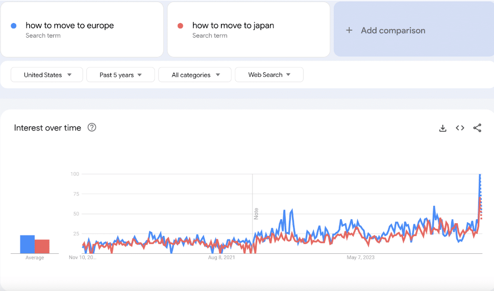 The way Google scores search terms is on a scale of 0-100. A higher score indicates a higher search volume compared to other periods. Over a period of 5 years, for users from the United States we can see that both “How to Move to Europe” and “How to Move to Japan” hover around 25. In general, Europe is a bit more popular search query than Japan. During the week of the November 2024 election, however, both search terms peaked dramatically.