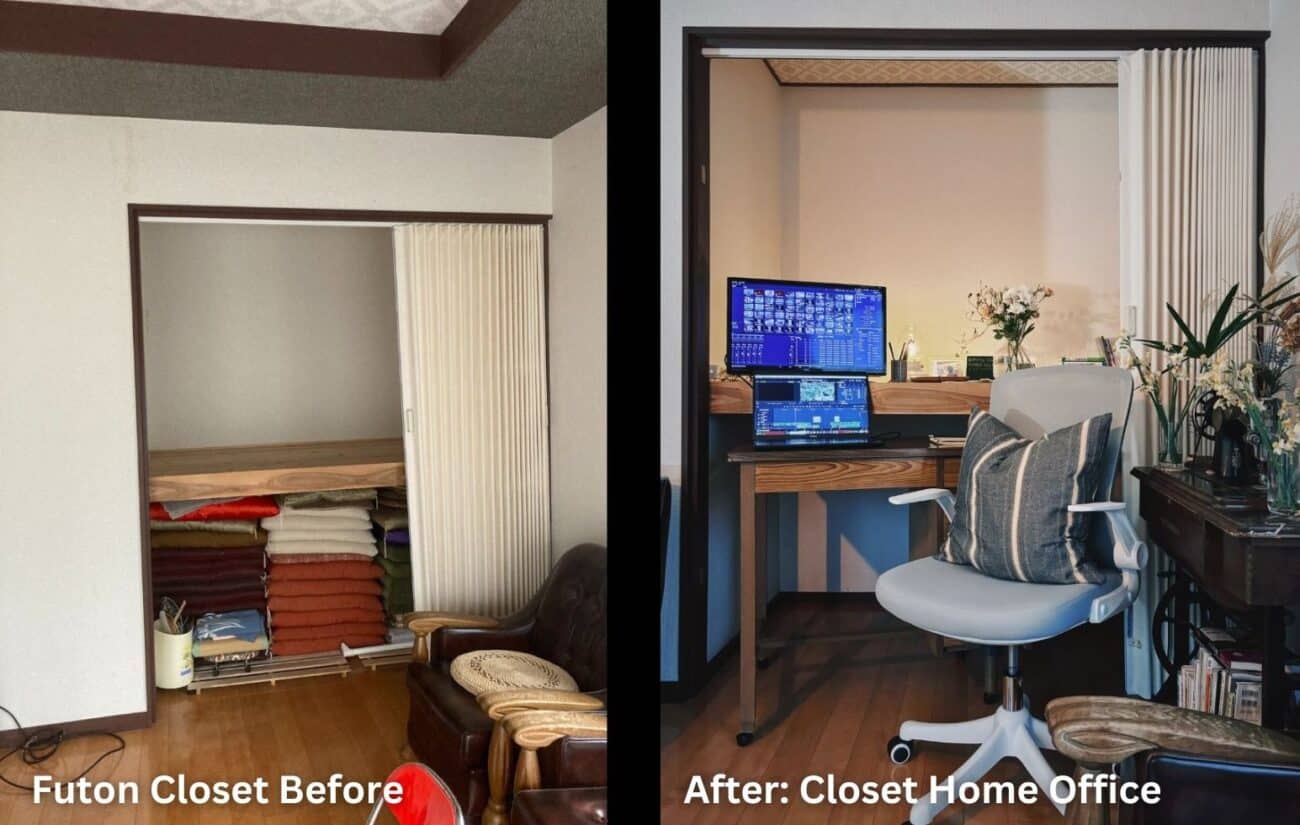 Maybe you’ve already seen closets turned into a home office before. But the opportunities are pretty strong in a Japanese house. Futon closets are in nearly every room, and the horizontal surface is a great space to place a monitor, printer, files, and anything else you could need for a one or two-person operation.